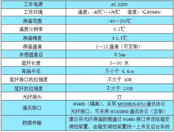 本系统采用荧光光纤温度传感技术,光源及荧光光纤全部为进口元件,具有耐高压、不受电磁干扰、本质安全、长期可靠、易扩展等优点,对风电、光伏使用的升压箱式变电站中干式变压器绕组、开关接点、电缆接头等各类监测点的温度进行实时在线监测,具有RS485及光纤通讯接口,MODBUS、IEC61850通讯协议,使开关柜进一步智能化、数字化、适用于智能化变电站的所有需求。